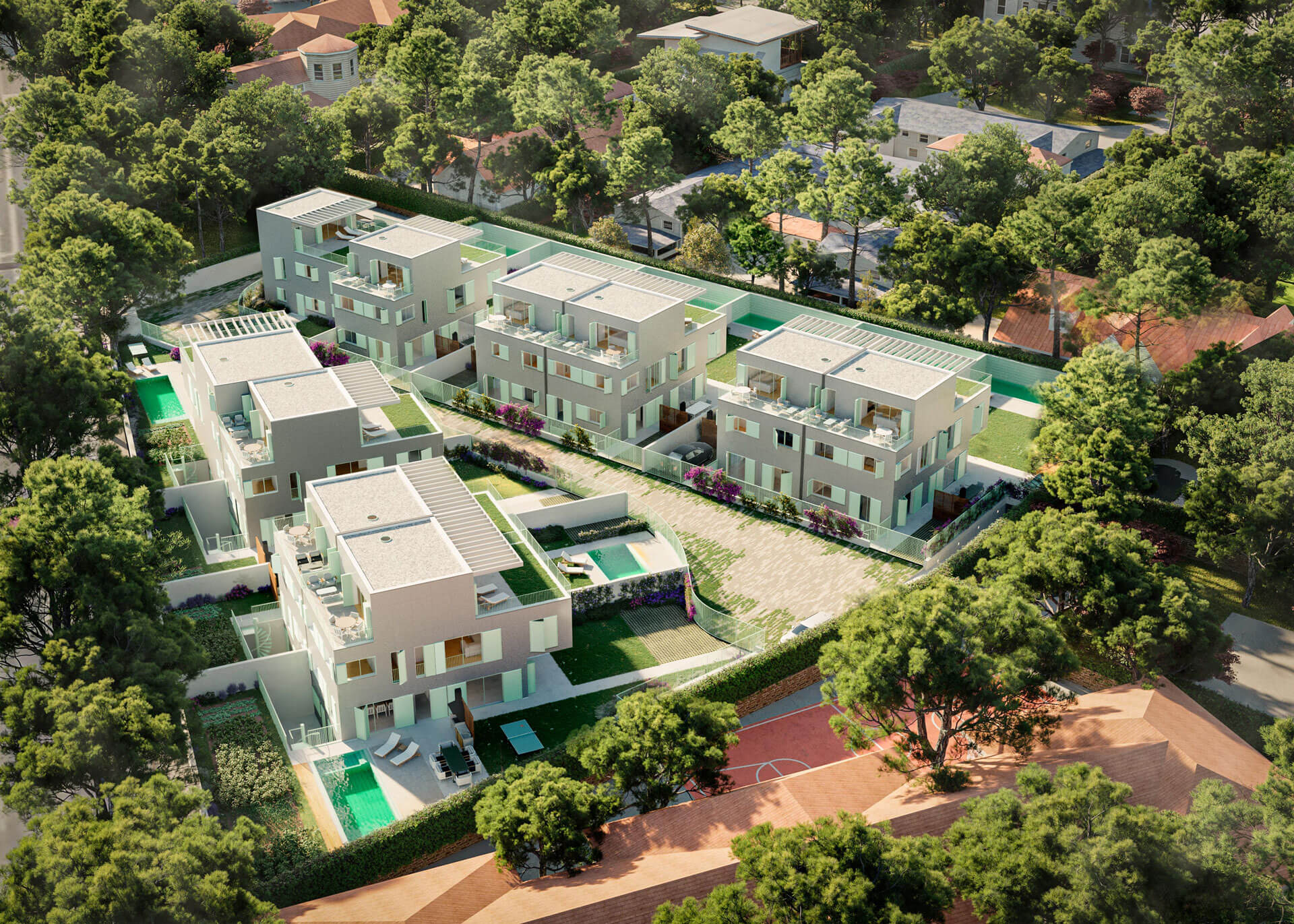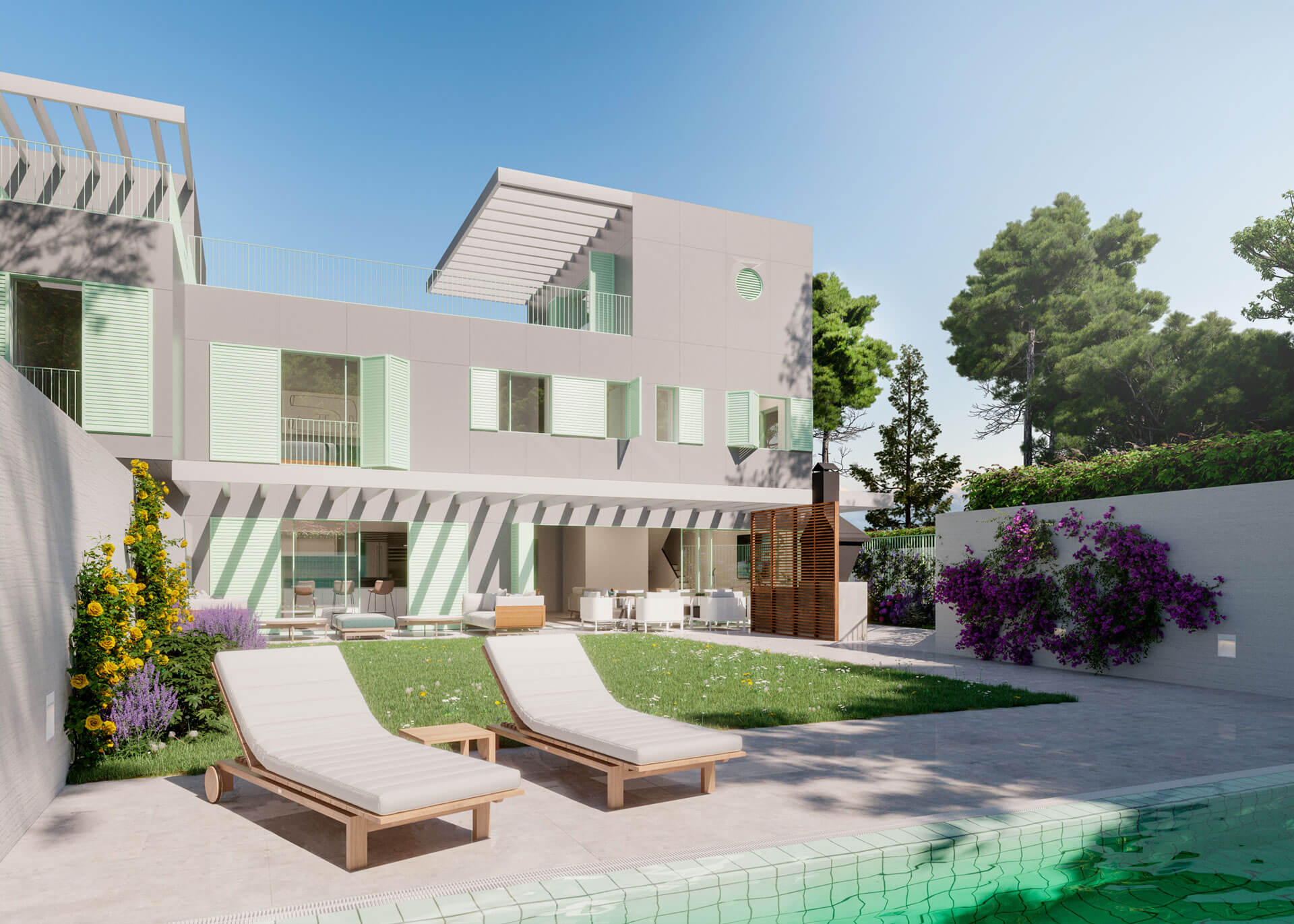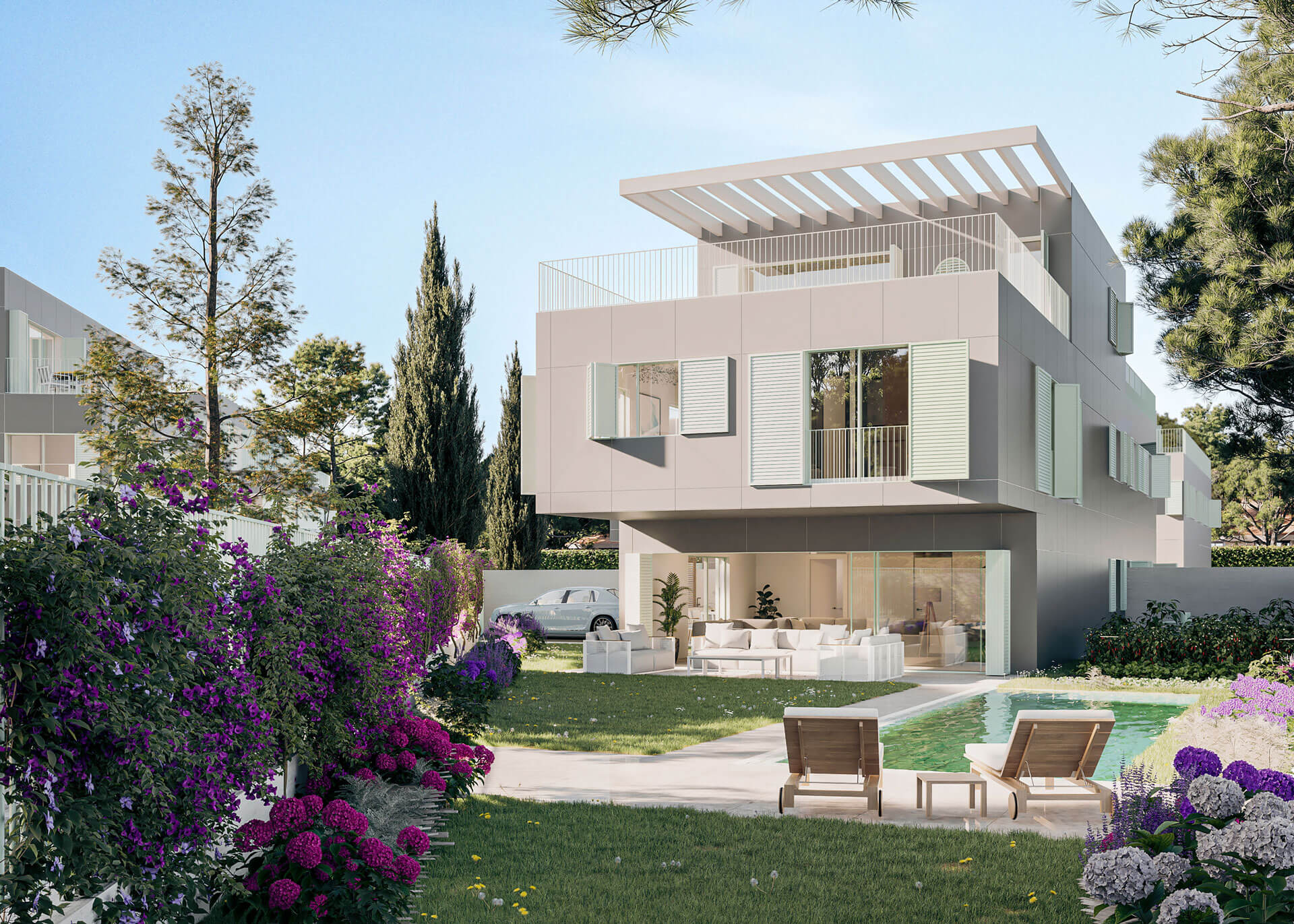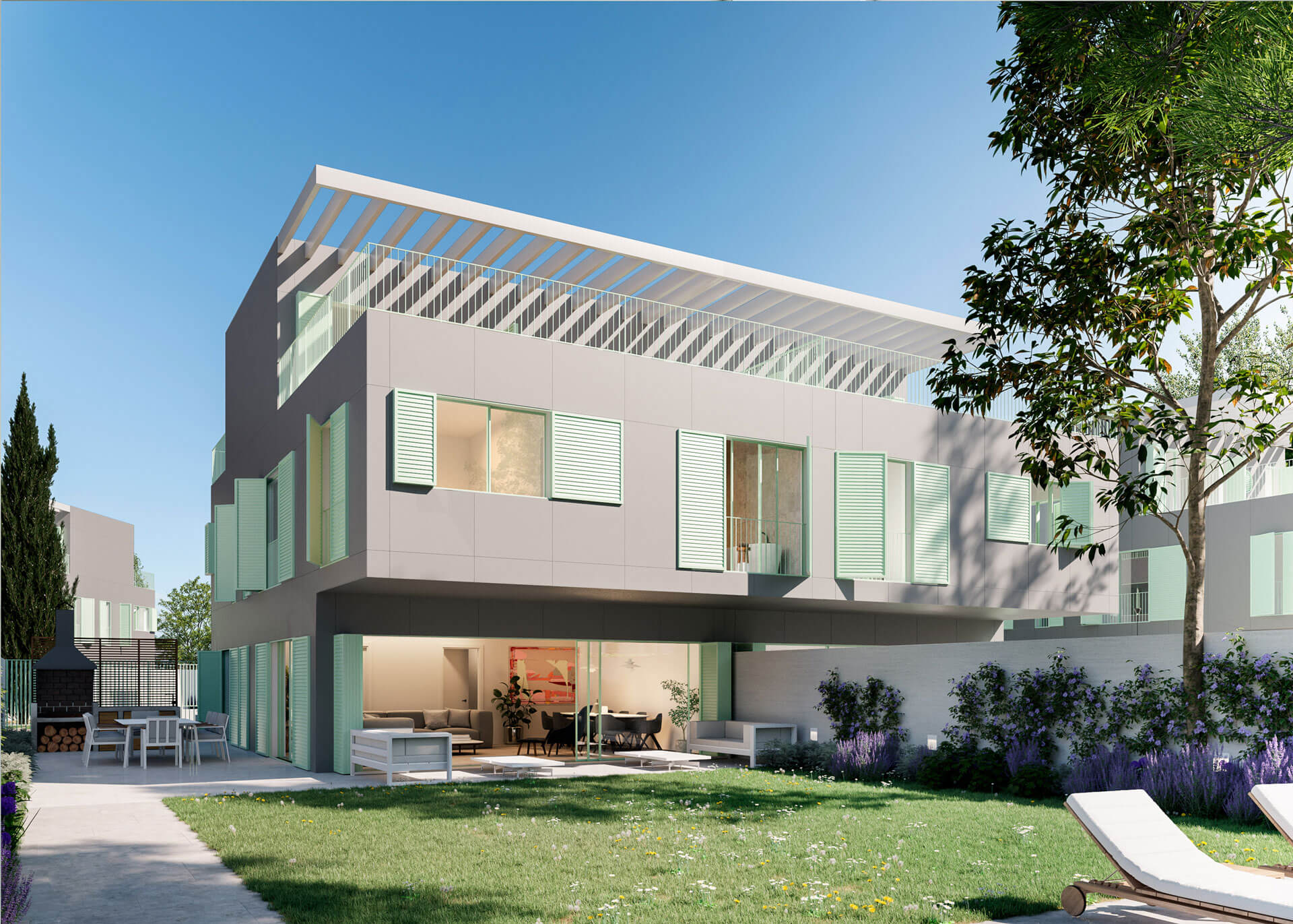 Green View Aravaca es una colonia de 10 viviendas unifamiliares pareadas con jardín y piscina privativos en Aravaca con una conectividad inmejorable a 8 minutos en coche del intercambiador de Moncloa.